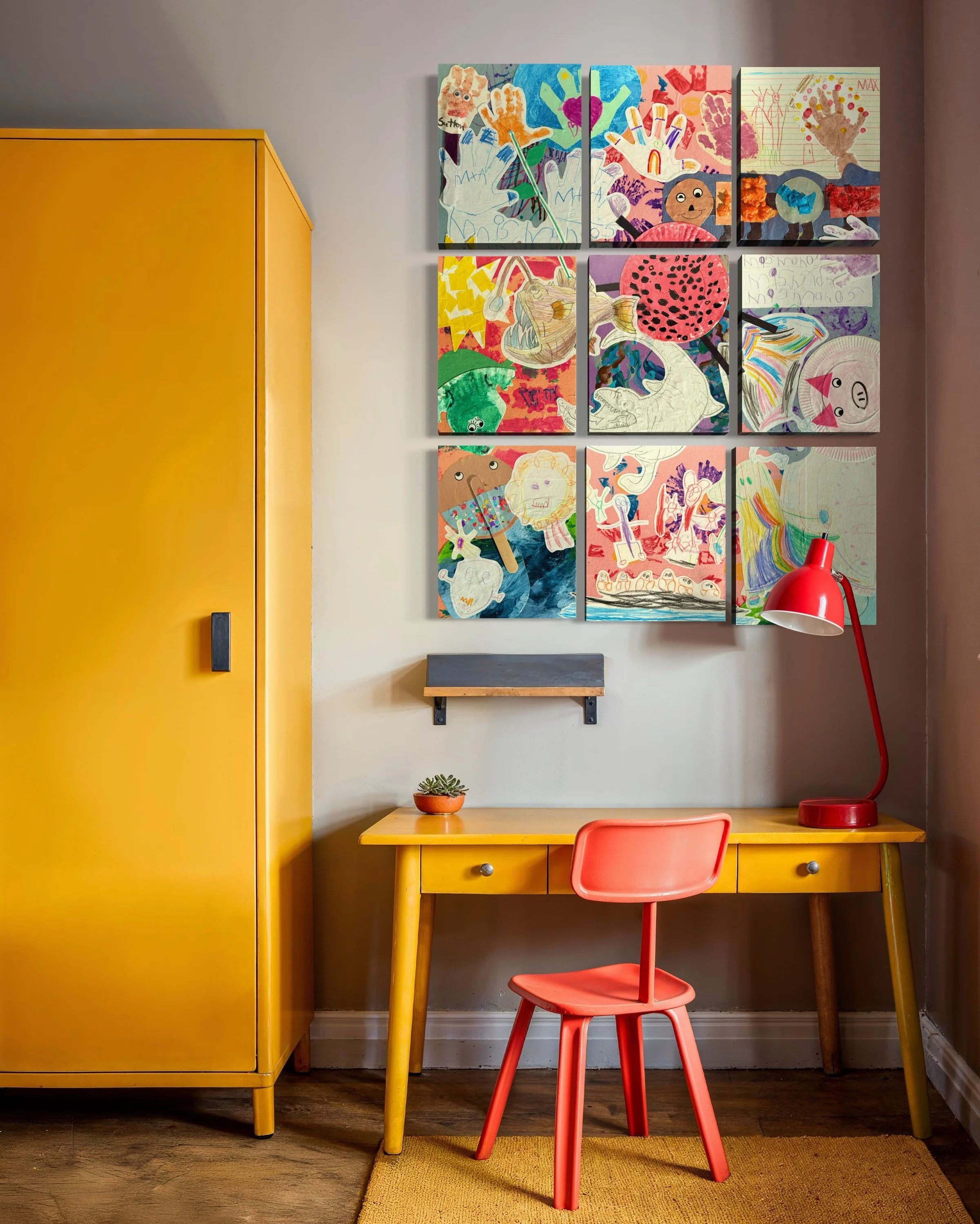 Each piece is a collaboration between nostalgia and design, where finger-painted suns and crayon rainbows become artful compositions worthy of display.